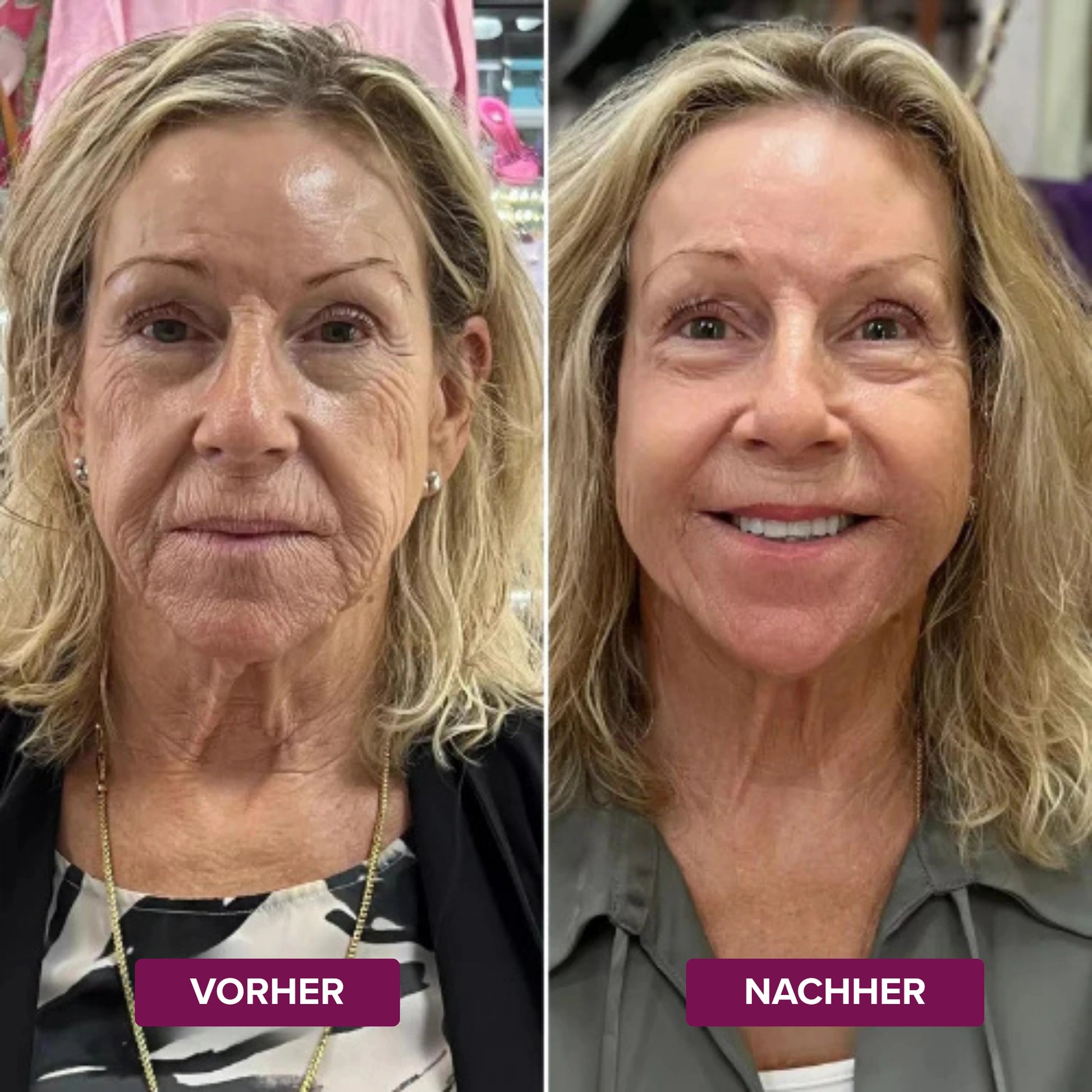 📅 Ab Woche 3 – Tiefe Nährstoffversorgung, eine gestärkte Hautbarriere und langfristige Kollagen-Unterstützung sorgen für einen jugendlichen Glow. Falten und feine Linien wirken deutlich reduziert, die Haut fühlt sich gesund und aufgebaut an.